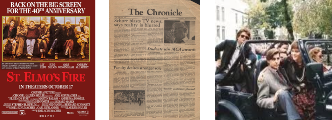 As usually only happens in the movies, less than a year later we were filming St. Elmo’s in D.C. with Rob Lowe, Demi Moore, Emilio Estevez, Andrew McCarthy, Judd Nelson, Ally Sheedy, Mare Winningham, and Andie MacDowell. As exciting as it was hanging out with those actors, one of my most vivid memories I have of the shoot was when Professor Paletz came to visit the set while we were filming in Georgetown. He was there with his son Gabriel and his daughter Susannah. Heartbreakingly, Darcy had passed away of cancer, but Susannah had that same smile and mop of curly brown hair of her mother. I recall their father explaining to him the basic information about how a movie is filmed. Perhaps it was not a coincidence that later Gabriel would become a film professor himself.